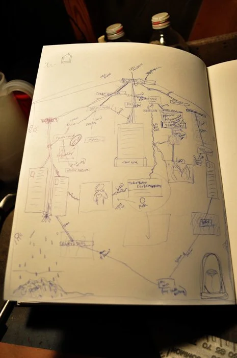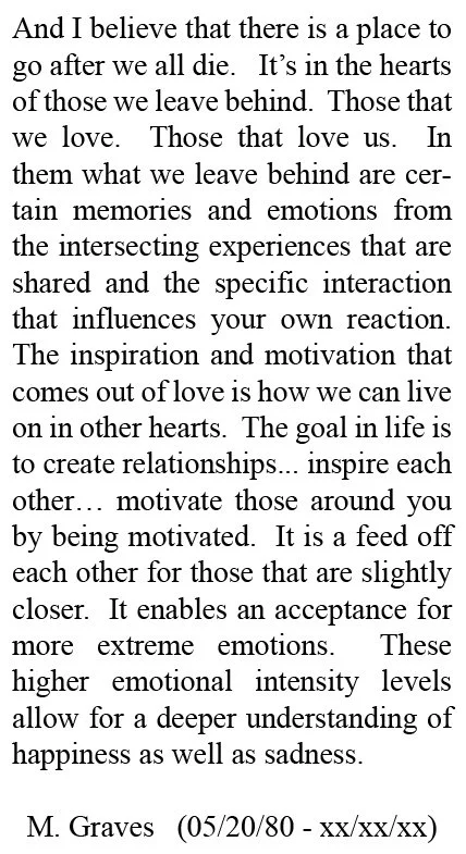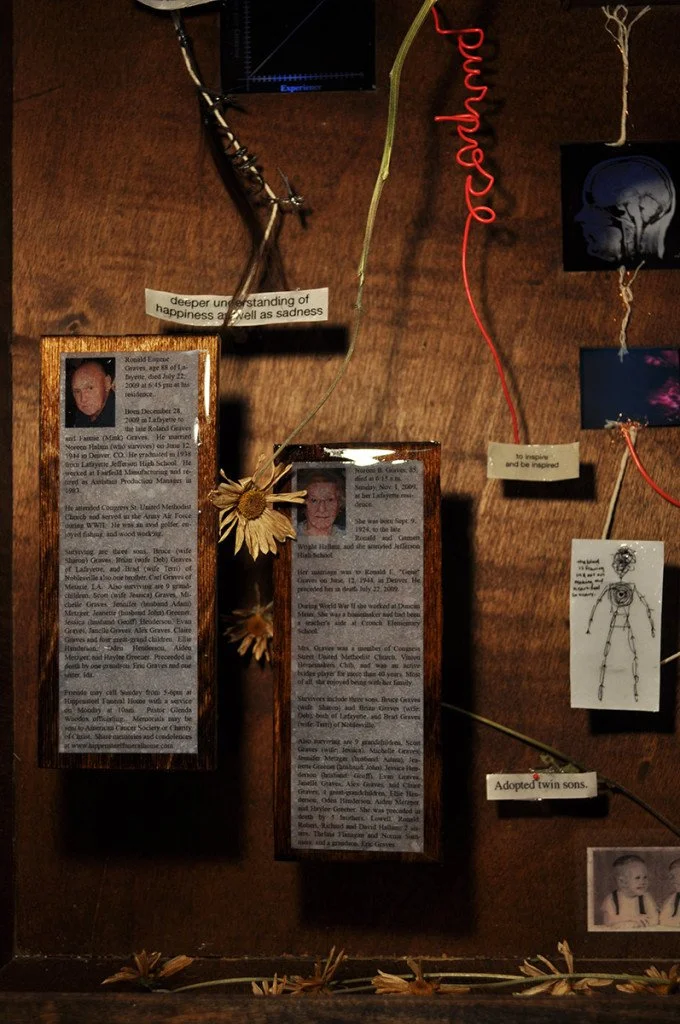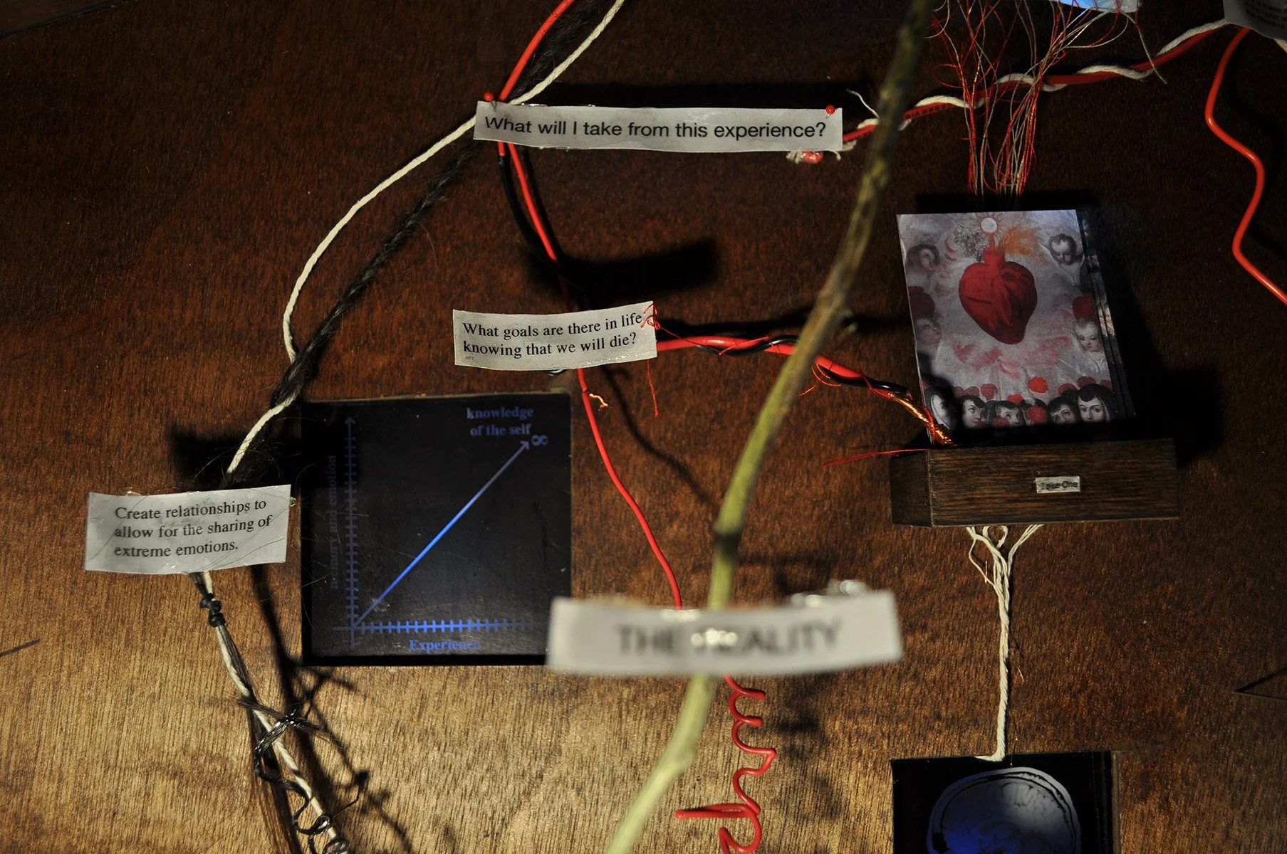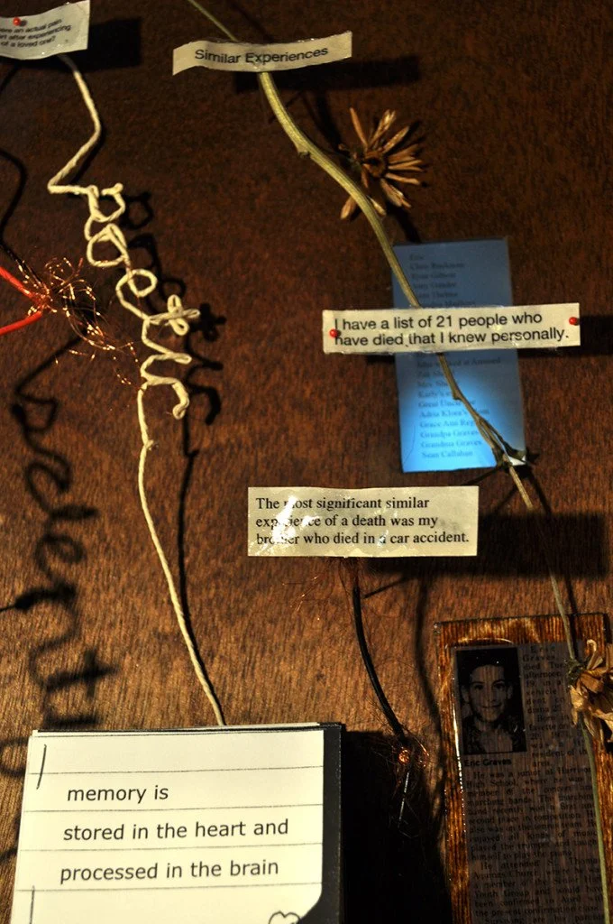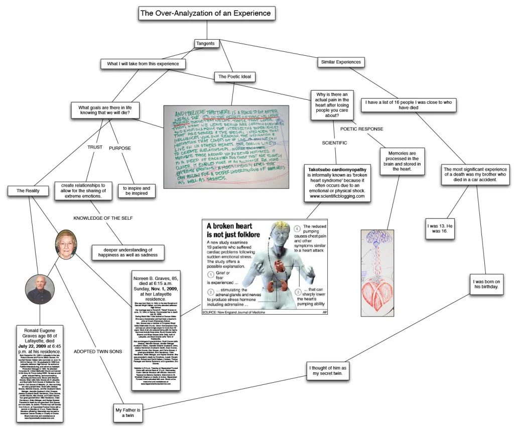 This is a response to the past death of my brother (1993) death of both my grandparents (2009). The mapping of the connections between these two similar experiences led to an unexpected full circle of associations. The map gives examples of past, present, future, and ideal aspects involving being alive and death.